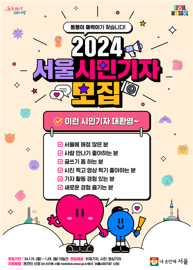 서울시는 올 한 해 정책·사업 등 다양한 서울시 정보를 직접 취재하고, 시민들에게 전할 ‘2024 서울시민기자’를 모집한다. 15일(월)부터 29일(월)까지 서울시민을 비롯해 서울 생활권자라면 누구나 가입해 활동할 수 있다.
