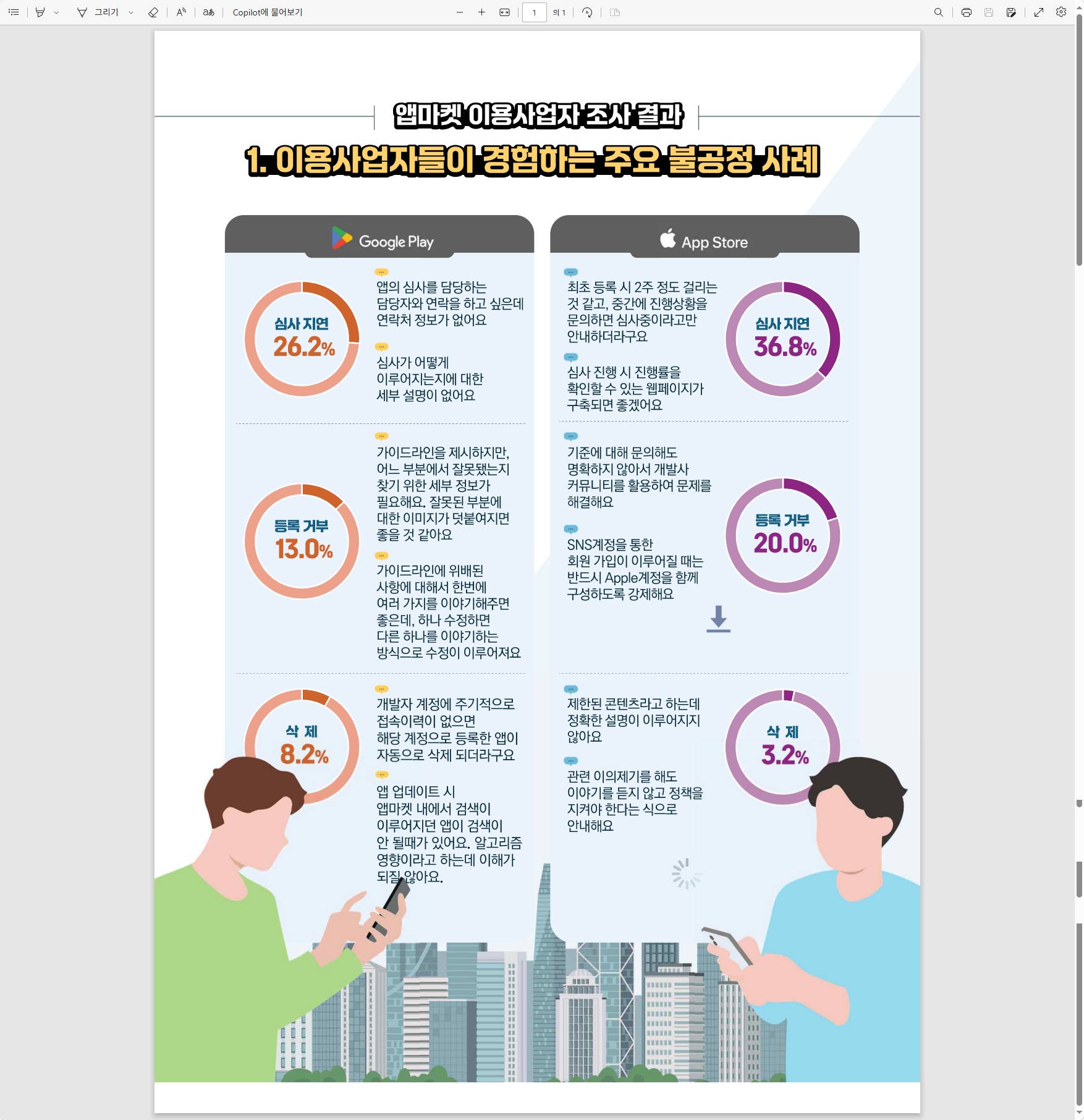 앱 개발자가 느끼는 주요 불공정 사례로는 앱 심사지연 경험(애플 앱스토어36.8%, 구글 플레이 26.2%)이 가장 높았으며, 앱 등록 거부 경험(애플 20%, 구글 13%)과 앱 삭제 경험(구글 8.2%, 애플 3.2%)이 그 뒤를 이었다.