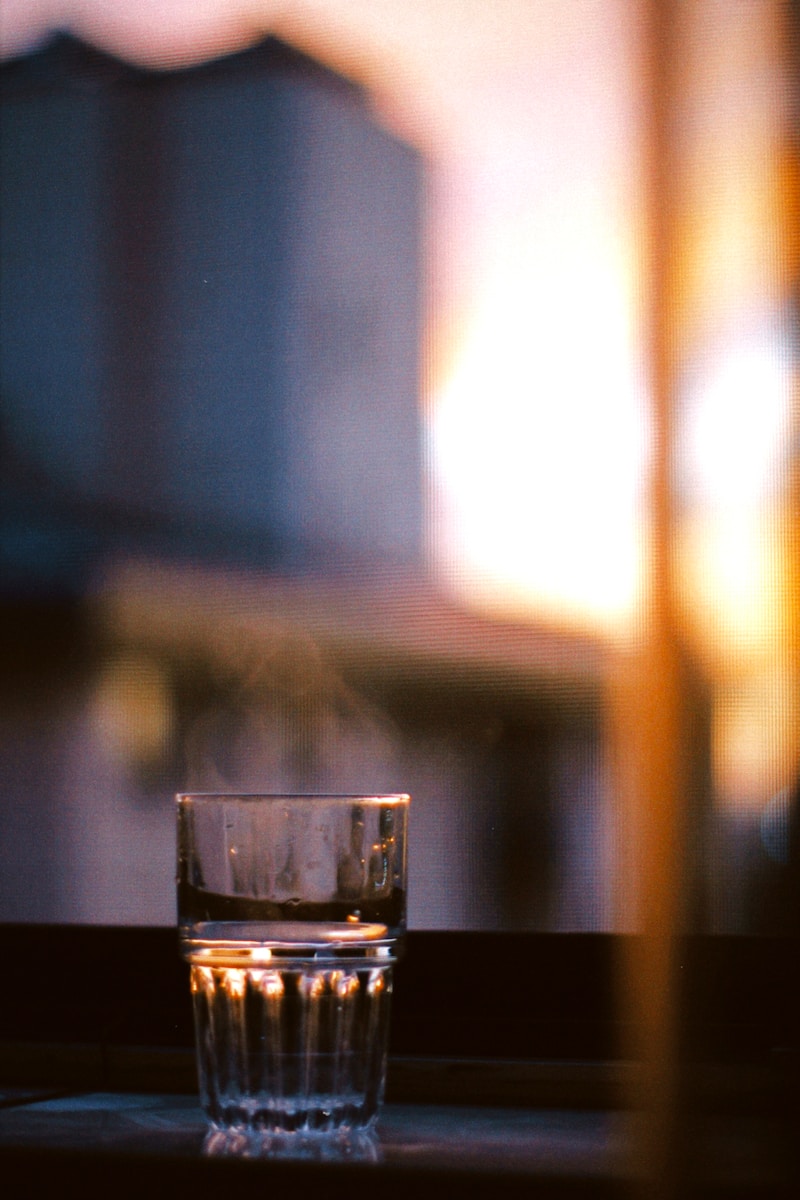 a glass of water sitting on a window sill
